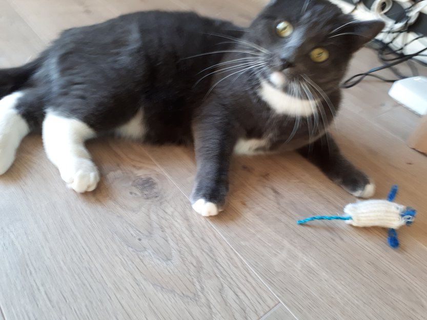 Grå med hvit hake, mage, framlabber og bakbein. Hun er ikke så stor ca. 3-3,5kg