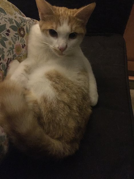Kjælen kastrert hvit og rødbrun kattunge dukket opp i hagestuen vår mandag kveld. Den har vært her på dagtid siden det og rigget seg til i en stol. Katten virker veldig ung; mellom 6 og 9 måneder. Er usikker på om han finner veien hjem, da han har sovet her de to siste nettene.