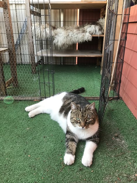 Han har et stort hvitt felt over brystet. Venstre forlabb er hvit opp til og med kneet. Ganske sort over ryggen. Hvit på hele magen. Noe tigerstripet. Sterk, rolig, nær og en ganske følsom katt.