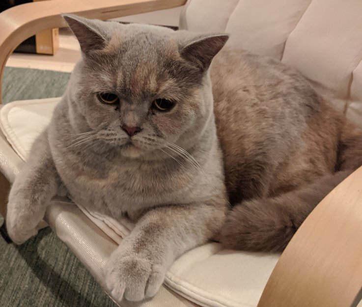 Lys grå hunkatt med lysebrune tegninger og kort, lodden pels.