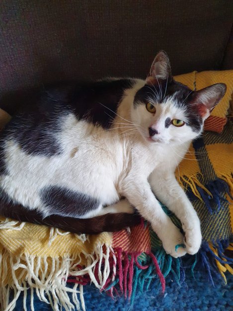Hun er ca 10 år, kosete, men forsiktig og sky. Liker våtmat. Utekatt som har vært lenge borte før, men aldri i storbyen. Mistenker at hun kanskje ble redd da det tordnet og har rotet seg bort.