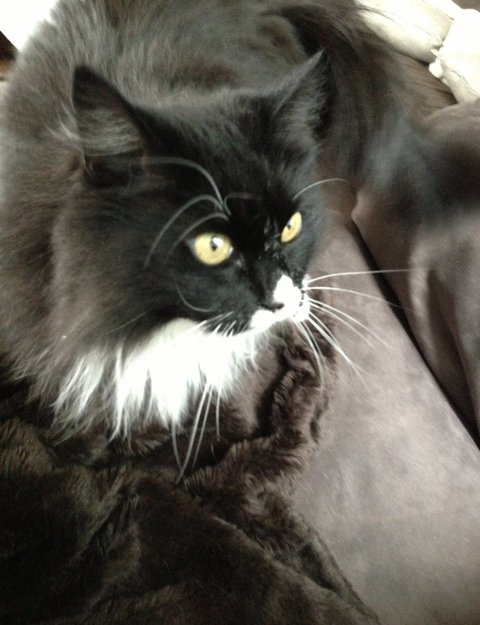 Sort og hvit langhåret katt. Hvite sokker på alle potene. Mest sort i pelsen
