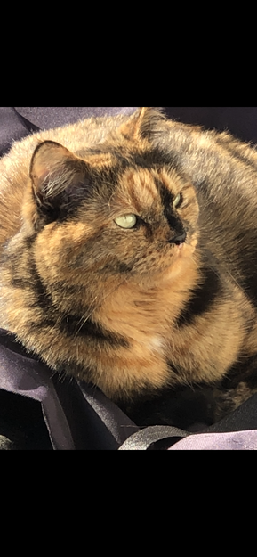 Brun/sort spraglete med grønne øyner. Hun veier ca 2,5 kg så hun er ikke så veldig stor.