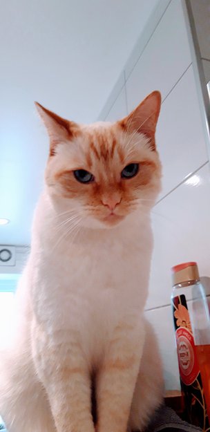 Knallblåe øyne, hvit,med rødstripet hale og fjes/ører.