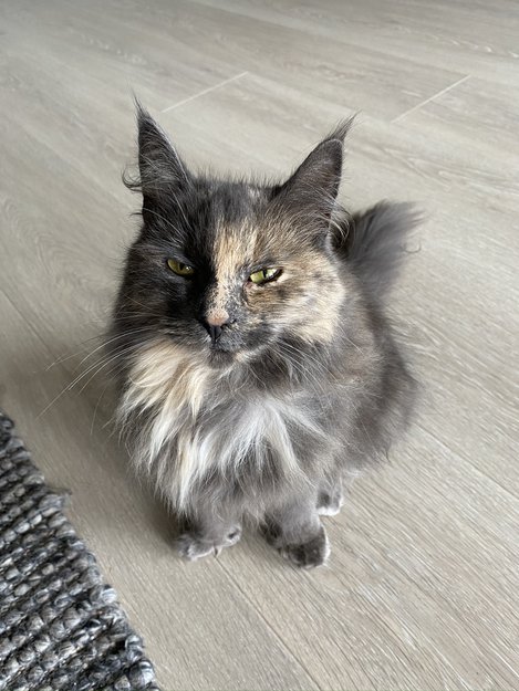 Grønne øyne. Grått og brunt ansikt. Litt hvitt på bryst og mage. Fineste pusen i hele verden. Skipskatt