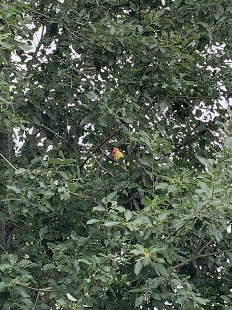 Ut fra bilder kan det se ut som en dvergpapegøye. Rødt hode, gul kropp og grå stjert.