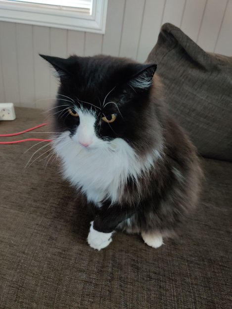 Hvit på nese/hake/mage og ytterst på potene, ellers helt sort. Nokså liten katt, ser større ut enn hun egentlig er pga lang pels.