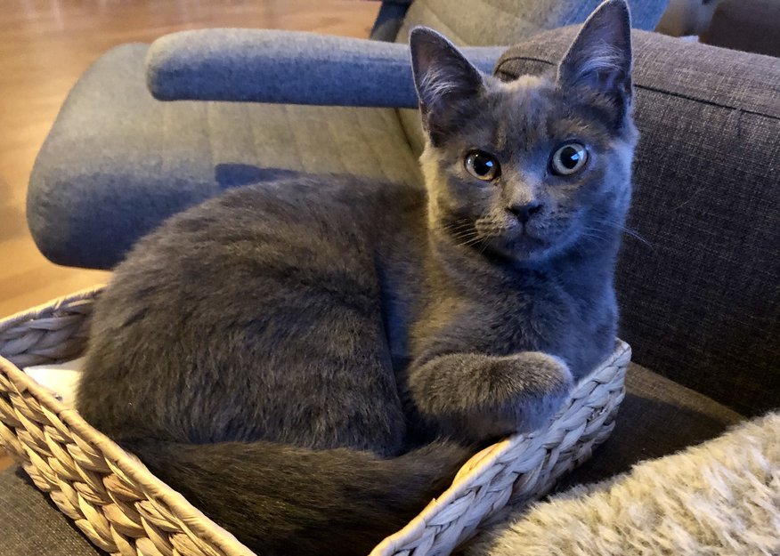 Luna er en snart ett år gammel hunnkatt. Hun er helt grå, korthåret og fortsatt ganske liten.