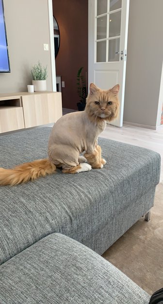 Katten fikk nylig en klipp hos dyrlege, så kroppen har ganske kort pels, mens hode, hale og ben har lang pels.