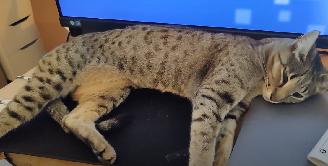 Pippi er en ung voksen katt, bare 3 kg. Hun er langbent og tynn, lysbrun med mørke prikker, lys nesten hvit under haken.