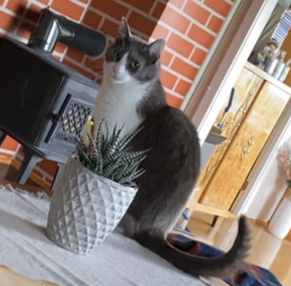 Han er en stor hannkatt, kraftige når han går. Kan se mindre ut når han sitter, store poter også. Grå på toppen og hvit under, han en barbert flekk på Venstre hofte etter operasjon. Den har ikke grodd helt enda så du ser tydelig at det er han. Han kan være menneskesky og litt aggressiv hvis du bare plukker han opp, har litt vondt i bakerste bein og liker ikke å bli tatt der.