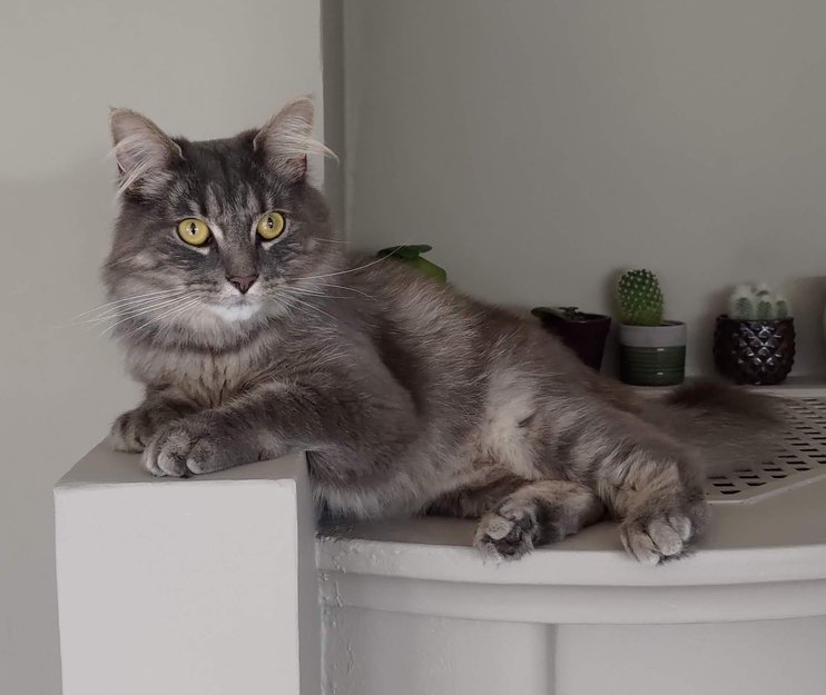 Grå med kvite striper, lang og buskete hale og "gaupeøyre". Hadde lilla halsband på seg då han gjekk ut på måndag.