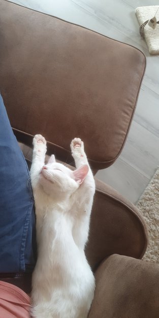 Ca. 5 mnd. gammel, helt hvit med blå øyne. Har et lite sår på høyre pote bak som fortsatt kan være synlig.