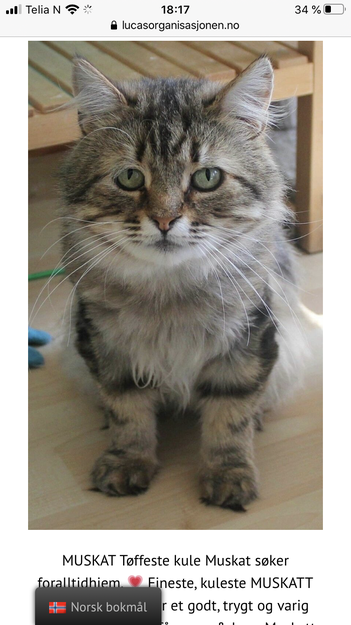 Muskat er en 9 år gammel hannkatt som har levd et tøft liv. Har han på prøveperiode hjemme hos meg i to uker for å se om dette kan bli hans nye hjem. I dag smatt han uheldigvis ut døren, og vi har ikke sett ham siden. Er en veldig redd og forsiktig katt (spesielt nå på ny plass), og han har lite mat og drikke i kroppen. Han gjemmer seg nok ved en bod eller lignende rundt Tastagata 20. Hatt satt stor pris på om noen ville ringt meg på 91313689 hvis de ser noe.