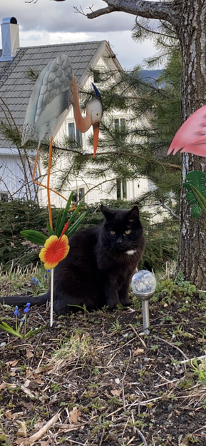 Sort katt. Ser at han begynner å dra på åra. Noe «hengende» buk. Sikler innimellom når maler. Har en hvit flekk på halsen/haken. Kjælen katt.
