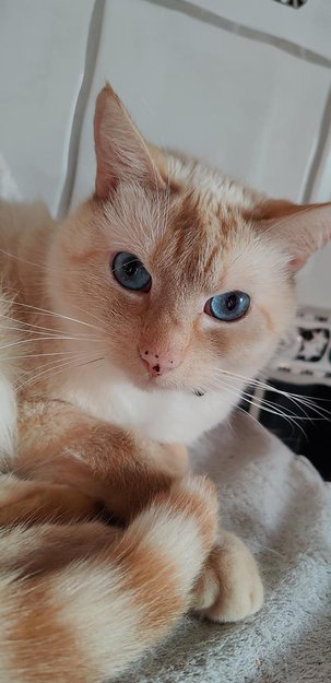 Kremet hvit med oransje striper på halen og deler av pelsen. Store blå øyne, og kan ligne på en rasekatt.