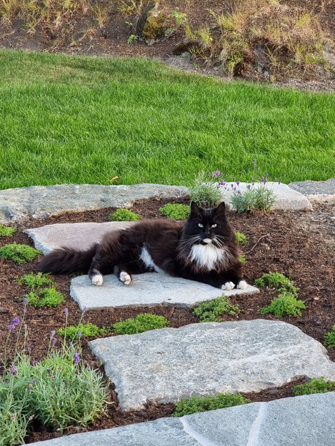 Katto ble med oss på ferie fra Oslo til sommerstedet vårt. Holder seg vanligvis nær oss og huset. Er ute om natten, står alltid klar utenfor vinduet på morgenen og vil ha frokost.
