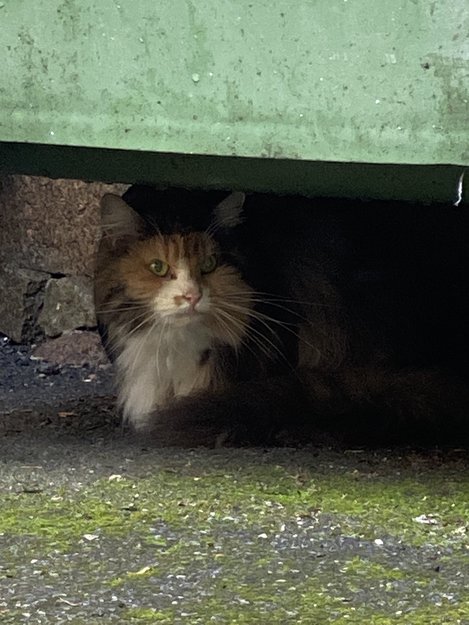 De siste ukene har en liten katt med lang pels og stor hale gått rundt i bakgården vår. Den er veldig skeptisk til nye mennesker men klarte å komme i kontakt med den. Tror den kan ha kommet seg gjennom et gjære bak bakgården og ikke har kommet seg ut igjen.