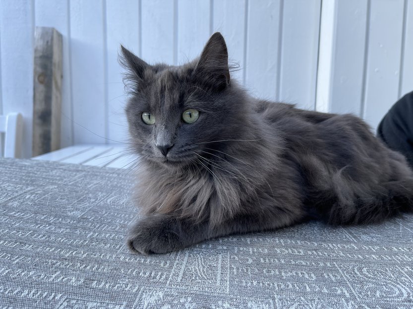 Hel grå katt med svart nese og grønne øyne. Han er ganske slank og er normal størrelse. Ca 4 kg.