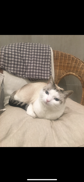 Hun er litt mindre i størrelsen enn andre katter, veldig sosial og har et kraftig mjau(når hun først får det til). Hun er veldig glad i å kose på mennesker, men ikke så glad i å bli klappet. Hun har tilnærmet hvit pels på mesteparten av kroppen, bortsett fra halen, ørene og litt av ansiktet. Halen hennes er svart-og gråstripet. Hun har rosa snute.