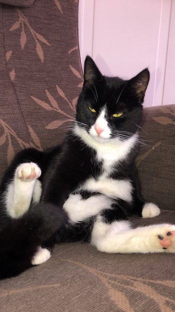 Svart med litt brunskjær. Hvit på underside, hvite "sokker", hvit trekant rundt nesen.