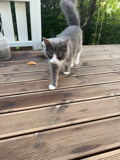 Pusen dukket opp i hagen til innmelder for ca to uker siden. Er veldig snill, kosete, virker ikke syk eller sulten. Er i fin form.