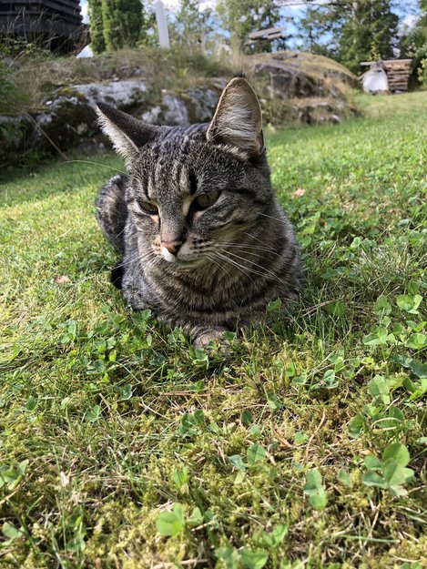 En pen grå katt kom til oss da vi satt ute på fredagskvelden. Den har i etterkant sovet på verandaen her og oppholdt seg ved huset vårt. Vi hadde ikke hjerte til ikke gi den litt vann og mat. Håper eier kan melde seg og få den tilbake da vi er allergiske