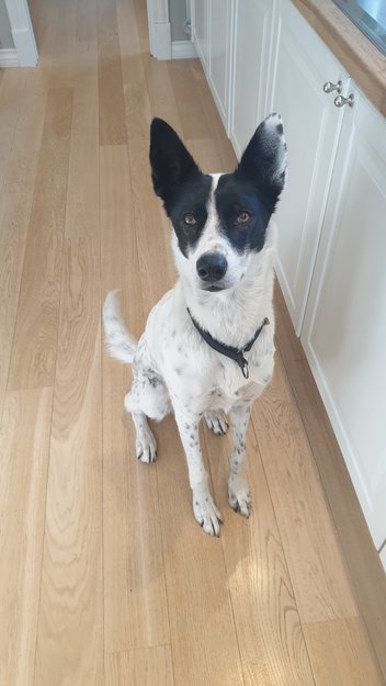 Sorte ører med hvit stripe fra snuten og opp til pannen. Sorte flekker/prikker på kroppen. Ellers hvit. Godt lynne og snill og forsiktig.