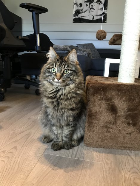 Norsk skogskatt, medium størrelse, grønn-gule øyne.