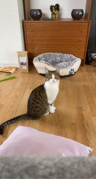 Hvitt på brystet og spraglete på rygg/hale. Veldig kjælen katt, ikke redd for mennesker. Hun er chippet