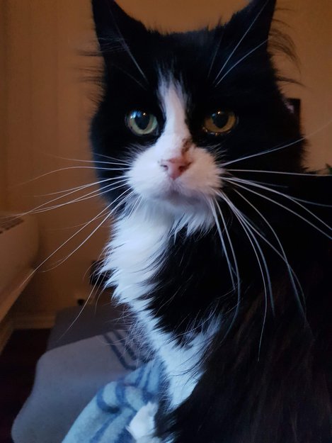 Tett tårekanal på høyre øyet (sett forfra) gjør at det væsker litt nedover snuten.