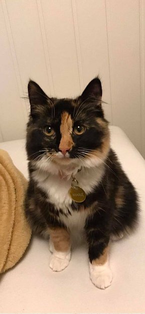 Hun har en brun strippe over nesen som er veldig lett å kjenne igjen. Hun hadde også på seg et rosa halsbånd med navne tag der det står Marie navnet henns på ene siden og nummert mitt på den andre siden.