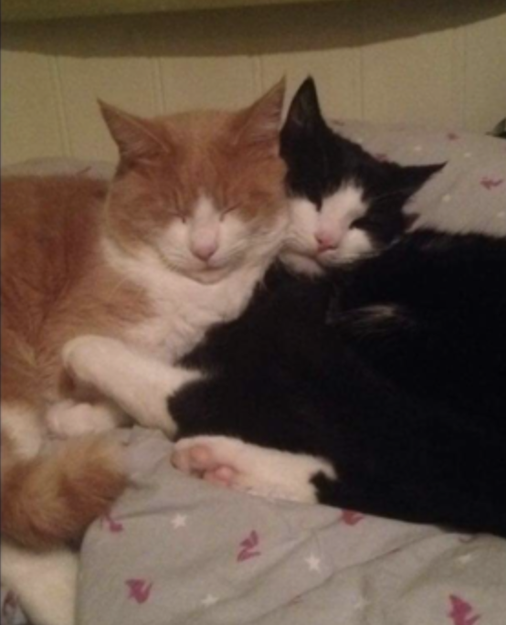 Begge kattene har hvitt ansikt. Den orange og hvite er litt langhåret