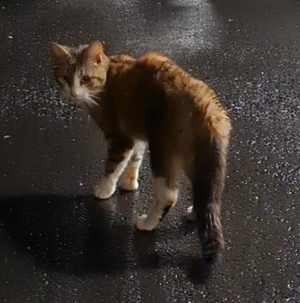 Hvit rundt snute og munn, hvite poter, mørkfarget hale, ellers brun og rødlig. Virker ung. Ikke funnet øremerke, ikke halsbånd.
