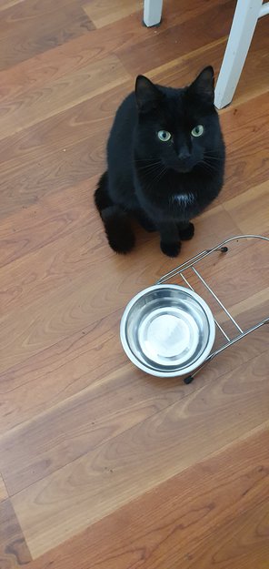 Helt svart med litt hvit i bryst. Vi bruker "ssssssssss......." lyd å kaller ham fra lang bort. Han er meower når han lyst å gå inn og ut.