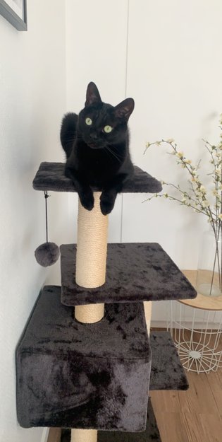 Helt svart i pelsen, utenom to hårstrå på brystet som er hvite. Har også et hvitt hårstrå over høyre øye. Grønne store øyne.