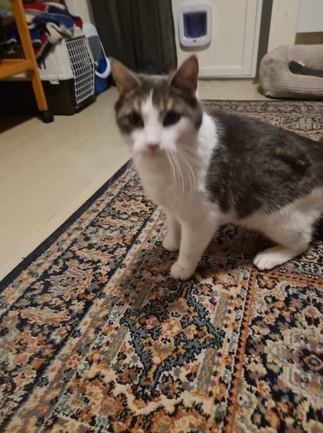 Han er slank, ekstremt kosete og pratsom. Han elsker mat og kos over alt på jord. Han er hvit og grå, med litt brunskjær. Kastrert hannkatt. Han er tatovert "ID" i venstre øre. 3 år gammel
