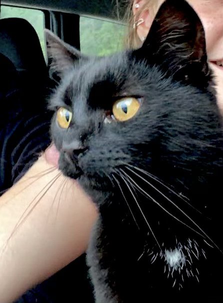 Svart liten katt med kvit flekk under halsen. Framstår som en liten katt og er redd for omverden