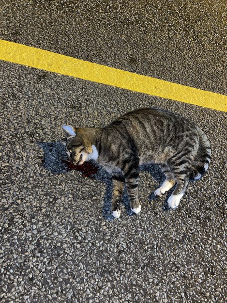 Vi kjørte hjemover og fant denne katten midt på veien, vi visste ikke hva vi skulle gjøre, så vi tok bilde av den og la den på siden av veien. Funnet rett ved dalgårdbrua. Ligger på siden mot Byåsen fra Kolstad.
