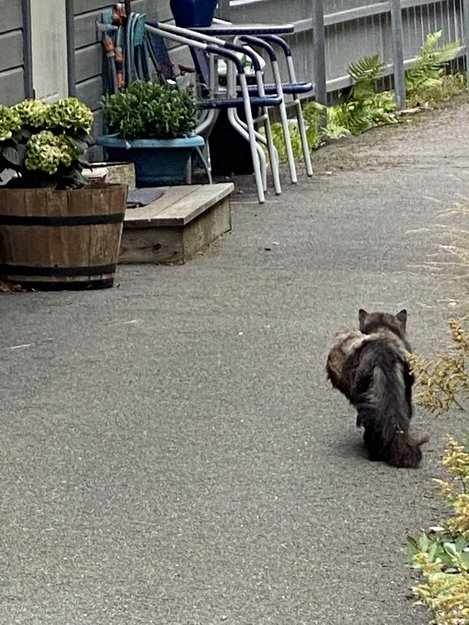 Noen som savner denne katten? Har satt ut mat og leter rundt i området. Den er i dårlig stand og har en stor kul på venstre side av magen.