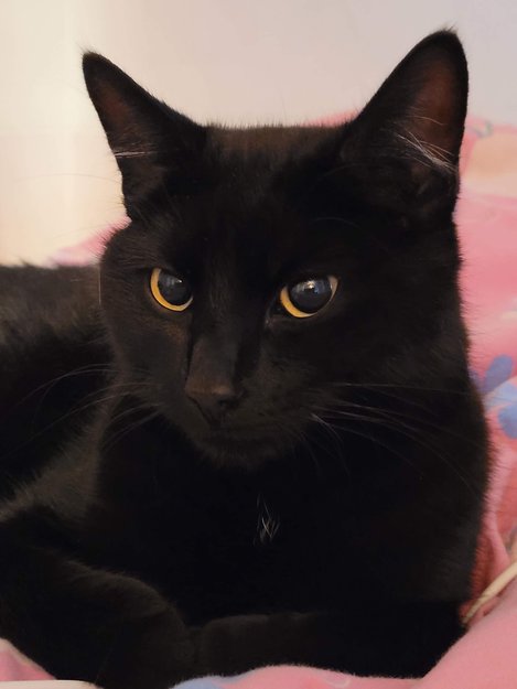 Helt svart, merket med "M" i det ene øret. Kastrert, chippet og uten halsbånd.