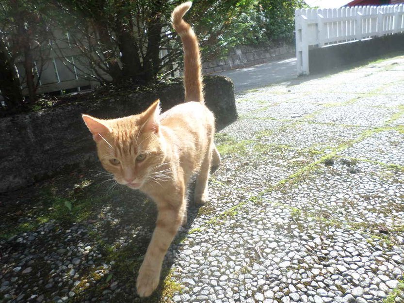 Ung, ukastrert, rødtabby (bredmønstret) hannkatt har dukket opp utenfor hos meg den siste uken. Den forsyner seg av piggsvinmaten. (Fôringsplasser for piggsvin er laget slik at katter normalt er for store til å få tilgang, men denne katten er liten nok til å få tilgang.)