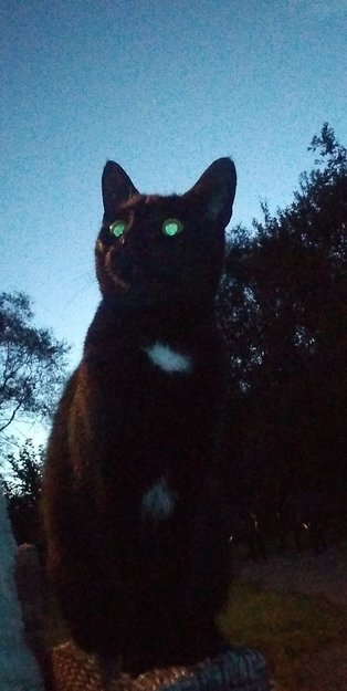 Svart pus med hvite partier på brystet. Virker frisk men er mager. Oppfører seg som en kattunge. Ikke sikker på kjønn. Den er veldig kosete, med på sine premisser. Blir stresset om man stryker den på ryggen. Har gitt den mat, og funnet den sovende inne i en stol. Kommet seg inn vinduet på natten. Den oppholder seg i hagen hele dagen, og kommer opp til huset og vil inn på kvelden. Håper noen savner den. Gule øyne, de ser grønn ut på bildet.
