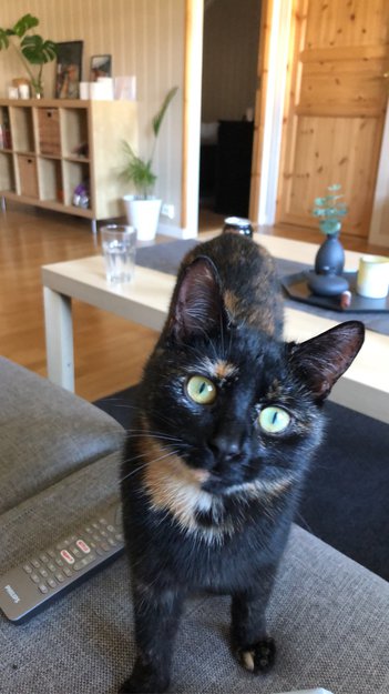 Liten, mørk katt med hvit/oransj flekk over Høyre øye. Hun har tydelig 2 farger på hakeområde hvit/oransj og svart.
