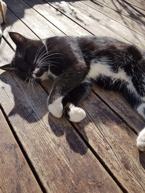 Han har en markant bært som ser ut som en sløyfe. Glad i hunder og kos, men kan ta tak i hendene dine med klørne om ikke du koser han på riktig plass. Veldig glad i mat, men slank.