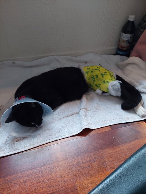 Pus med krage, tok turen ut. Den har bandasje på bakryggen og ene frem foten.