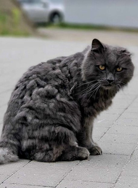 Det ene øret er sammenkrøllet og han er veldig tjukk.