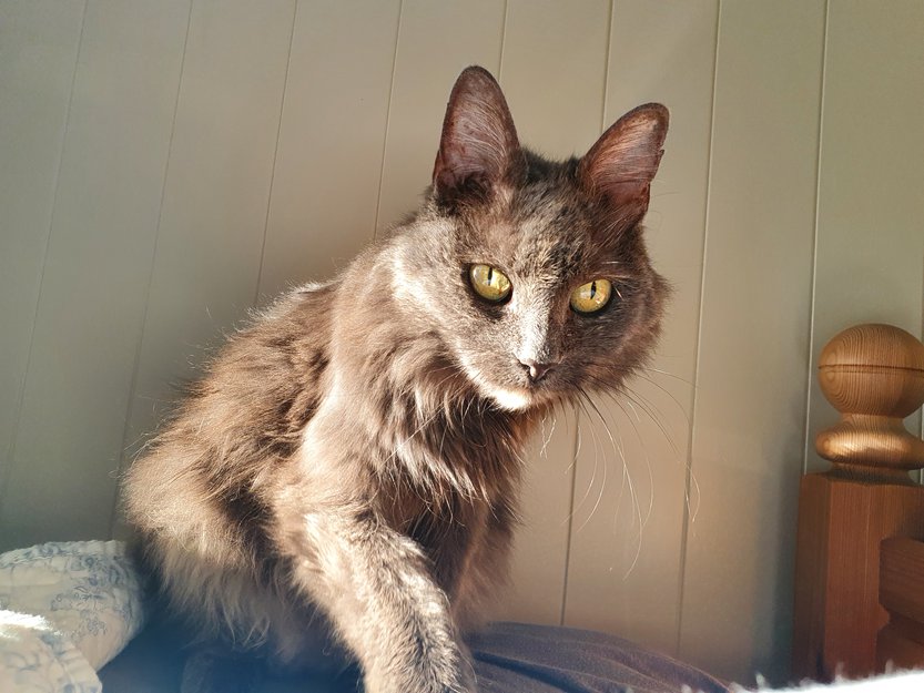Pus var med mine foreldre på hytta. Hun har gått ut, men er ikke så kjent i området. Hun er en gammel og veldig liten katt. Gjemmer seg ofte under hekker og busker