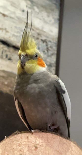 Nymfeparakitt med grå fjærdrakt, gult hodet og hanekam, med røde kinn. Veldig glad i å plystre, og er oppmerksomhetsyk
