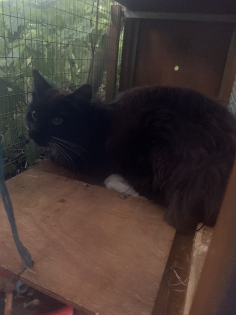 Svart og hvit,- liten katt. Har hvite «sokker» og hvit trekant på brystet.